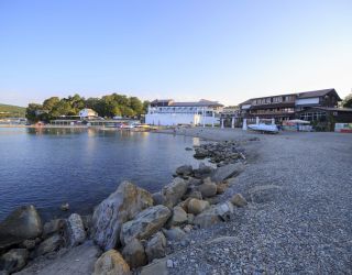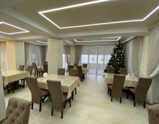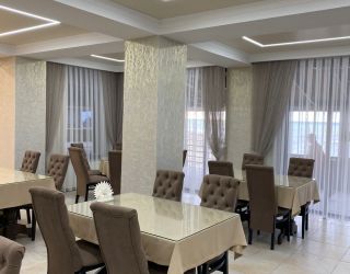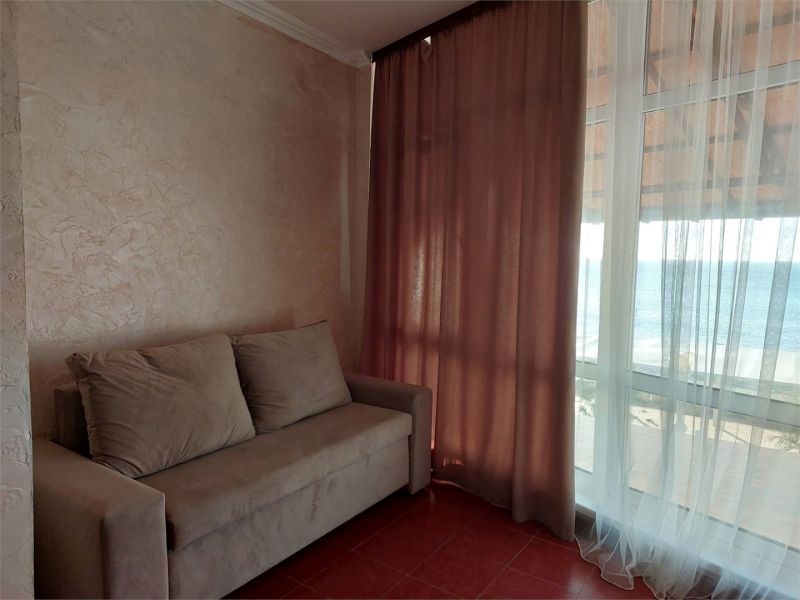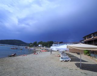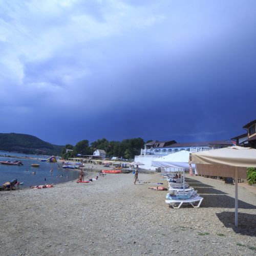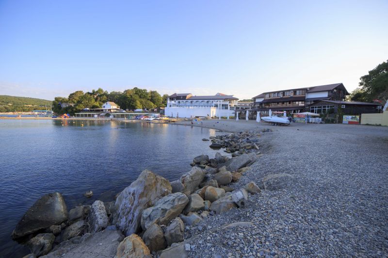 Буквально в двух шагах живописный галечный пляж, оборудованный всем необходимым.
